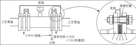 1、安裝在非金屬管道上的不帶接地電極的電磁流量計必需選配耐介質(zhì)侵蝕的接地環(huán),用≥4mm2銅線將接地法蘭(接地環(huán))與電磁流量計相銜接,接地線從電磁流量計法蘭上接入接地網(wǎng)。